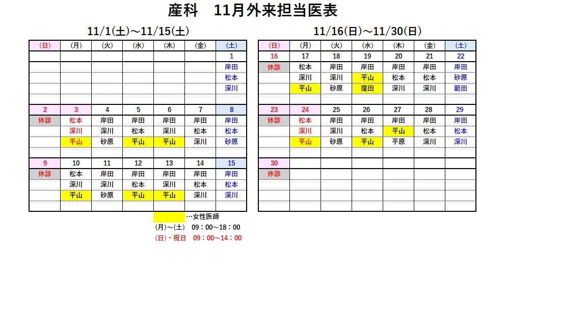 - 11月の外来担当医表をUPしました。診察医師のご希望のある患者様はご参考になりましたら幸いです。